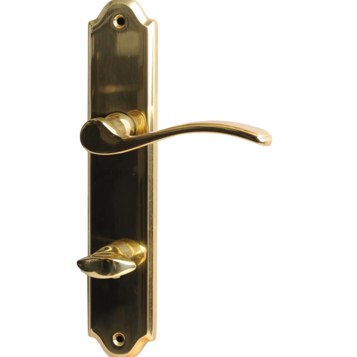 Erleben Sie mit der Alpertec Langschildgarnitur Lori-LS für WC poliert ohne Feder eine moderne und stilvolle Lösung für Ihre Bad-WC-Türen. Die Garnitur besticht durch ihr elegantes Design in goldfarbener Messingoptik und ist sowohl für links- als auch rechtsanschlagende Türen geeignet.