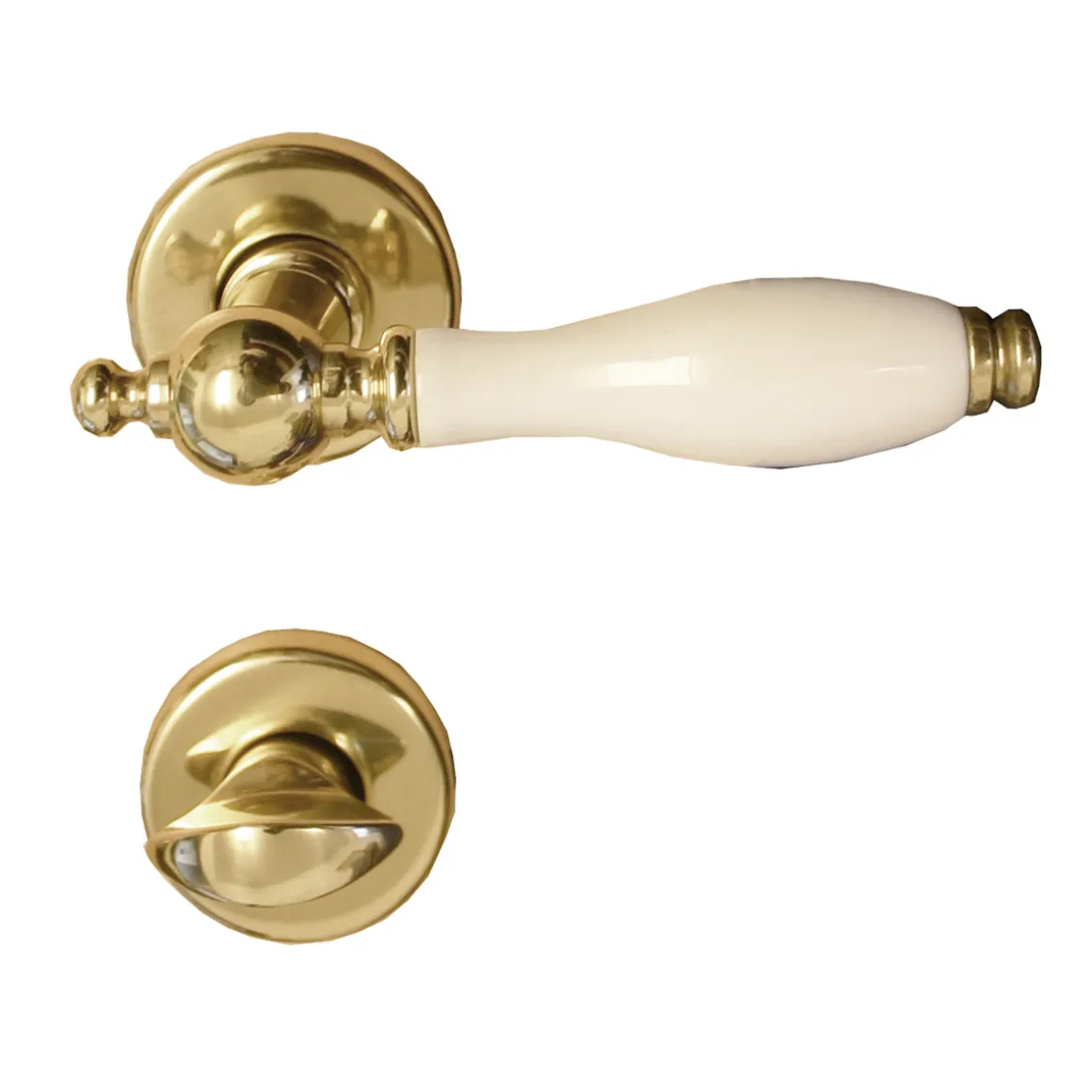 - Ausführung: Rosette, Oberfläche Messing, Variante Drücker/Drücker, Material Messing, Porzellan