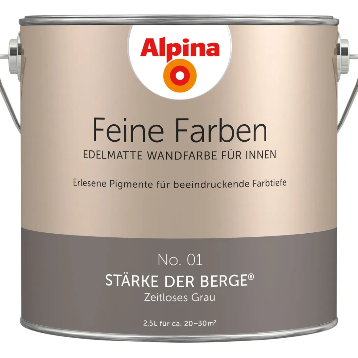 Erleben Sie mit Alpina Feine Farben Stärke der Berge eine zeitlos elegante Wandgestaltung. Die hochwertige, edelmatt matte Wandfarbe überzeugt durch ihre erlesenen Pigmente und beeindruckende Farbtiefe. Mit einer Nassabriebbeständigkeit von Klasse 3 und einer hohen Deckkraft ist sie besonders strapazierfähig und eignet sich ideal für Wände und Decken in Wohn- oder Arbeitsräumen.