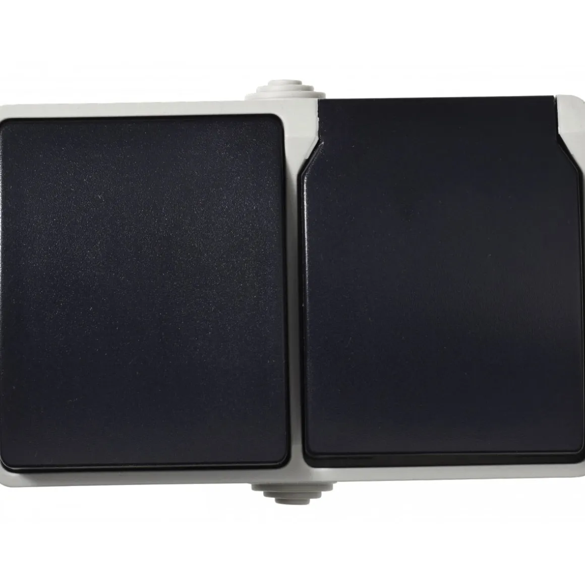 Sichern Sie sich jetzt die robuste Aufputz-Schalter/Steckdosenkombination Basic Feuchtraum 2-fach in der Farbe Grau für den Einsatz in feuchten Innenbereichen!