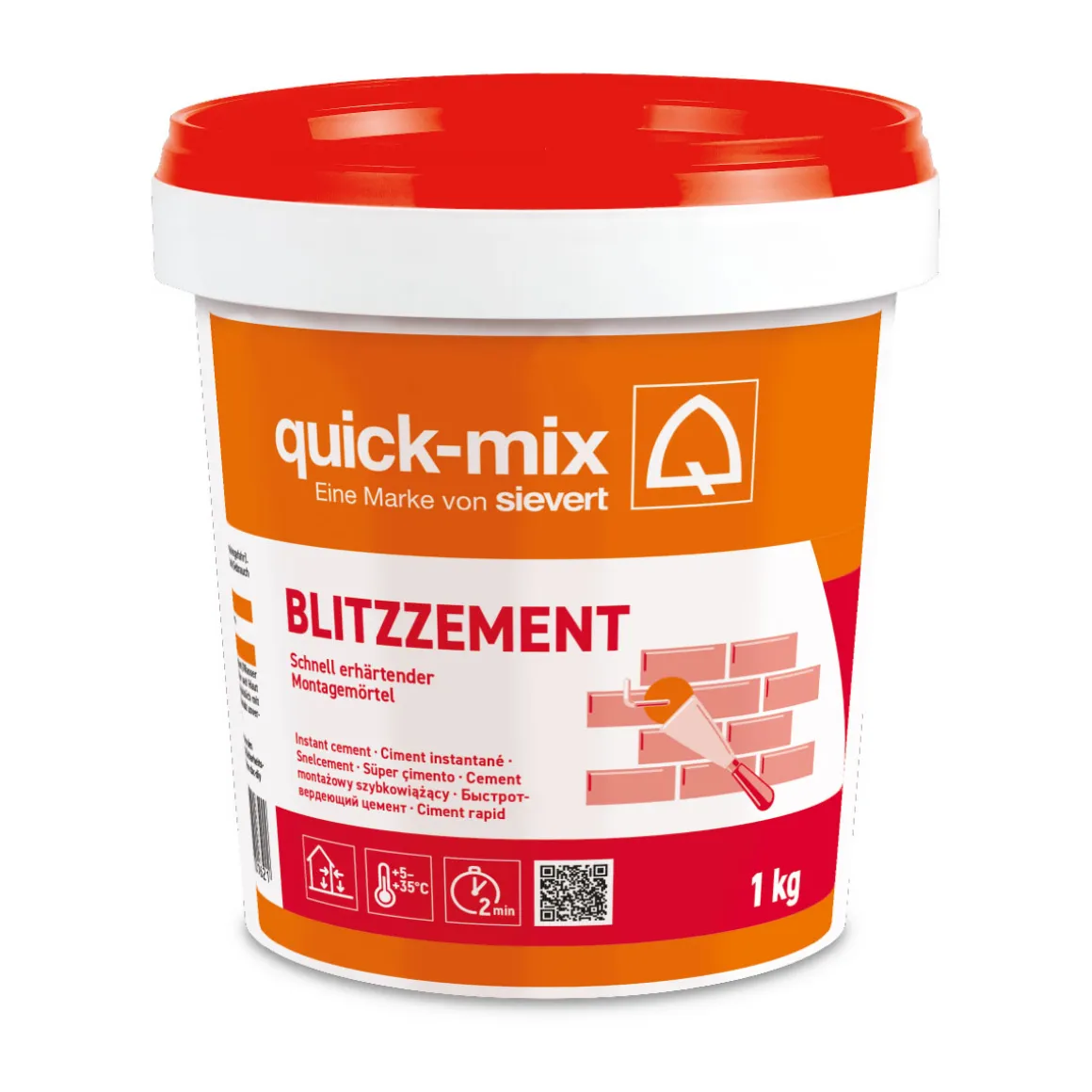 Mit dem Blitzzement von quick-mix können Sie schnell und einfach Reparaturarbeiten an Beton durchführen oder Regale, Lampen und andere Gegenstände sicher befestigen. Der Zement ist witterungsbeständig und frostfest.