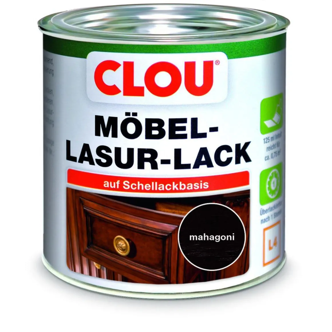 Mit dem Clou L4 Möbel-Lack in Mahagoni können Sie Ihre Holzmöbel im Innenbereich schnell und einfach auffrischen. Die transparente Lasur sorgt für einen seidenglänzenden Look, während die Maserung des Holzes sichtbar bleibt. Der Lack ist wasser- und kratzbeständig und bildet eine harte Oberfläche.