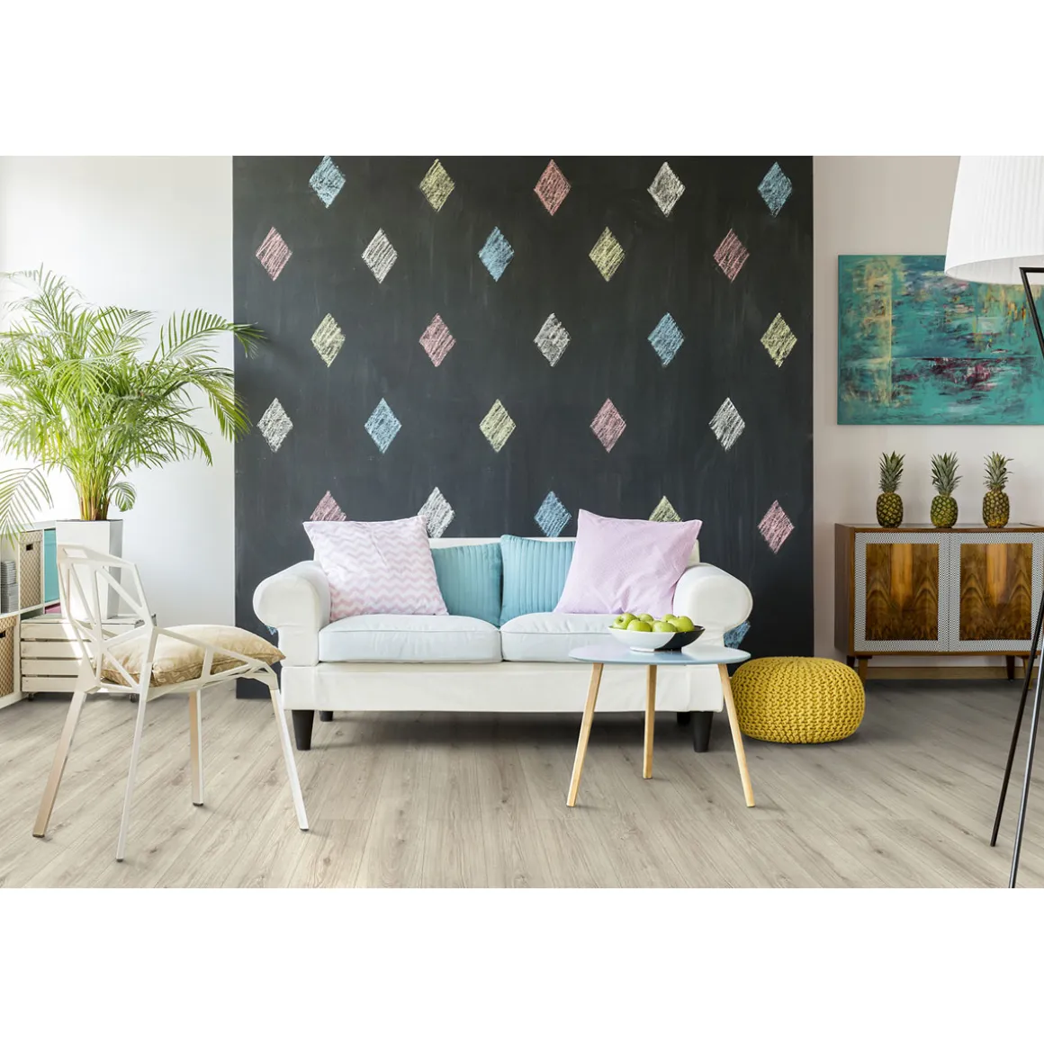 Der Designboden HydroClick Nordische Eiche bringt Eleganz und Funktionalität in Ihr Zuhause. Mit seiner authentischen Holzoptik und der wasserbeständigen Oberfläche ist er nicht nur ein optisches Highlight, sondern auch unglaublich praktisch. Die helle Farbgebung sorgt für eine freundliche Atmosphäre, während die robuste Nutzungsklasse 33 selbst den Anforderungen gewerblicher Räume standhält. Ob im Wohnzimmer oder Büro – dieser Boden macht überall eine gute Figur.
