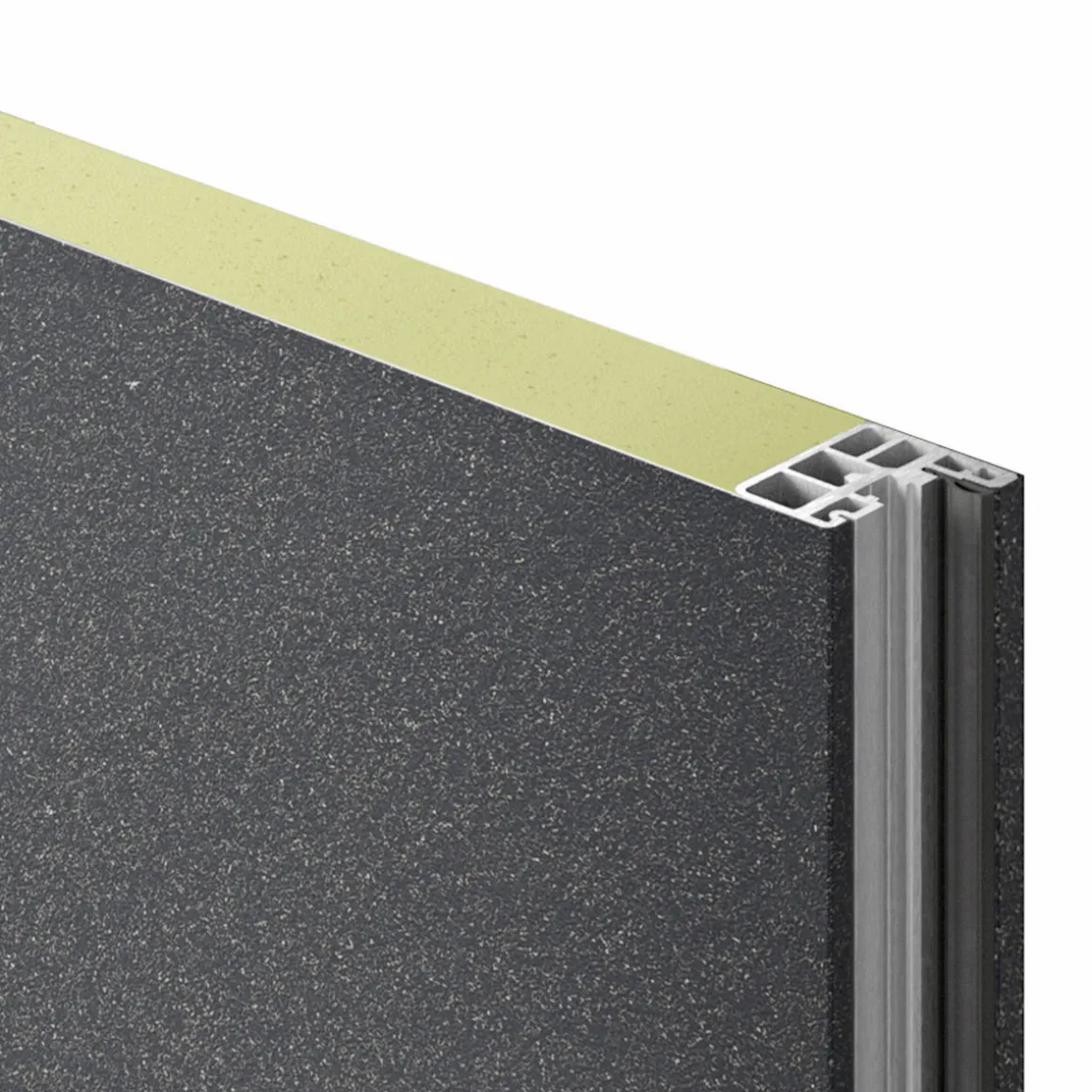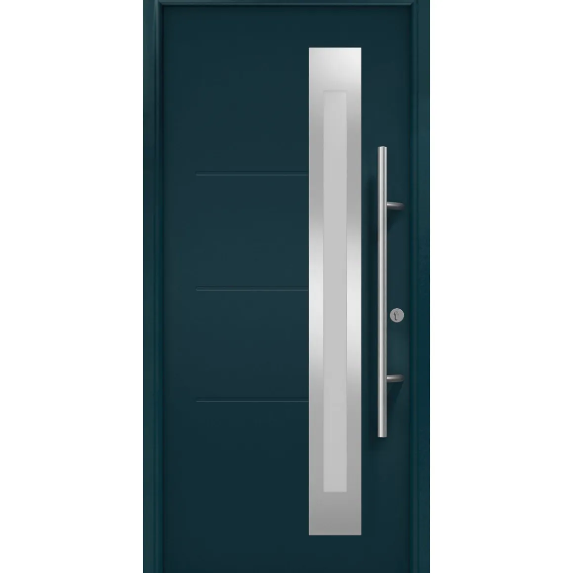BxH ca. 110×210 cm, innen und außen flächenbündiges Stahl-Türblatt Stärke 65 mm, verkehrsweiß (RAL 9016) oder anthrazitgrau (RAL 7016), PU-Hartschaumfüllung, thermisch getrennter Aluminium-Rahmen, Stärke 60,5 mm, 3-fach-Isolierverglasung mit beidseitigem Sicherheitsglas, innen und außen satiniert, 3-fach-Verrieglung