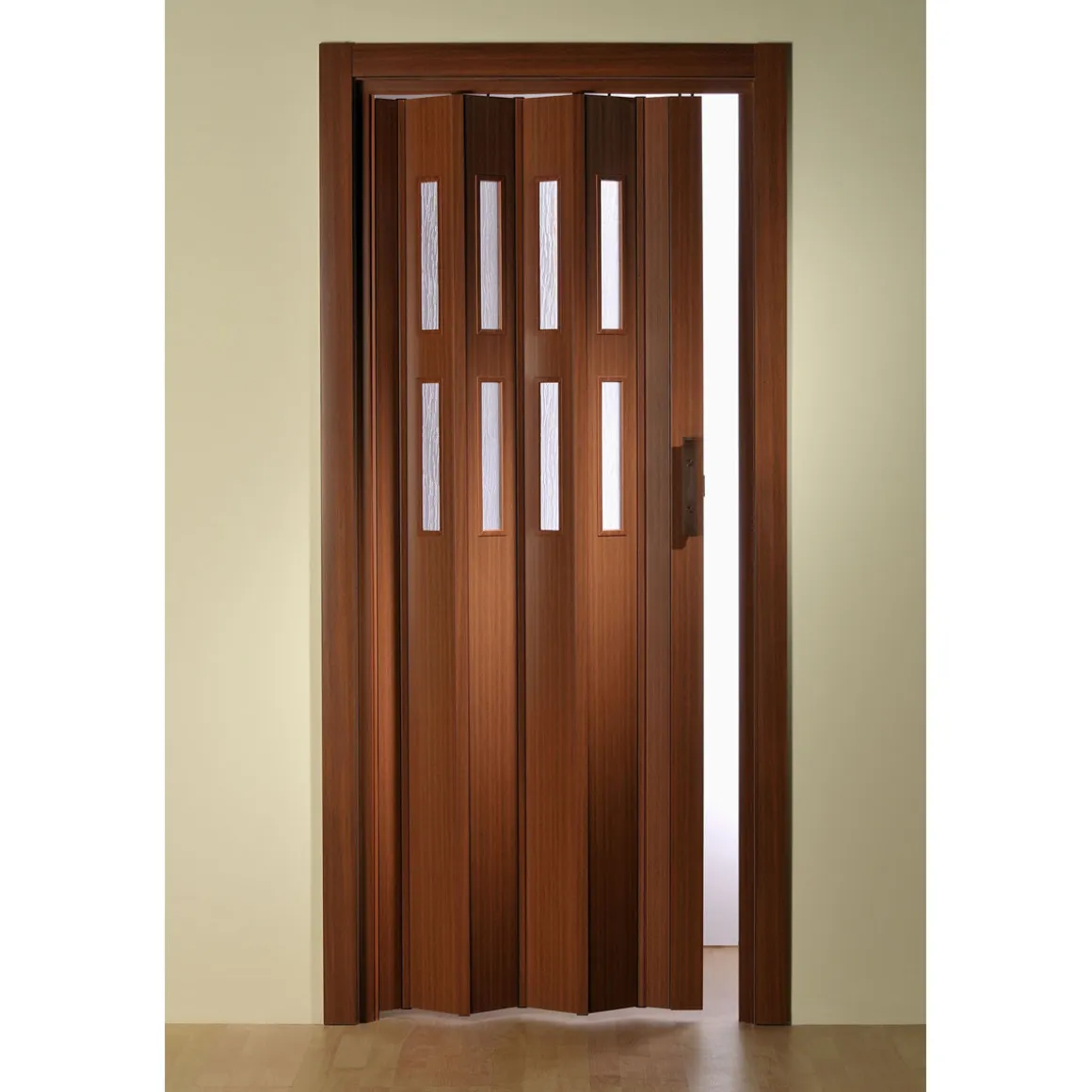 Unsere Kunststoff-Falttür Modell „Luciana“ – die moderne Alternative in verschiedenen Farben. Hochwertig bedruckte Varianten für holzähnliche Oberflächen oder in weiß-Pastell, die in jedes Ambiente passen. Falttüren können in Türbereiche mit und ohne Zargen eingebaut werden und eignen sich damit perfekt für alle Bereiche im Wohn- und Gewerbebereich. Hochwertige Faltmechanismen ermöglichen ein geräuschloses Öffnen und Schließen. 10 mm-Hohlkammerprofile geben der Tür gute stabile Eigenschaften, die ein langlebiges Produkt ausmachen.