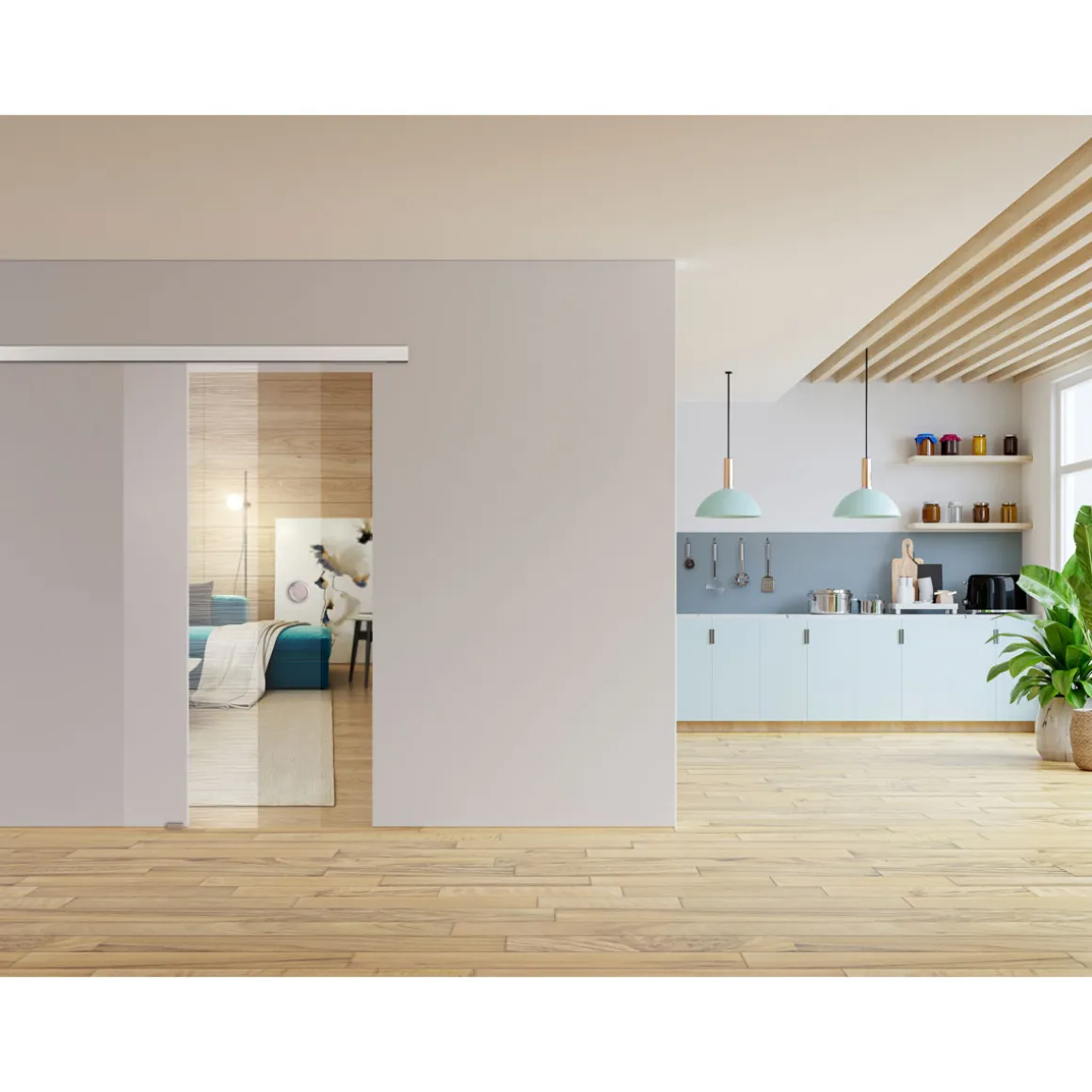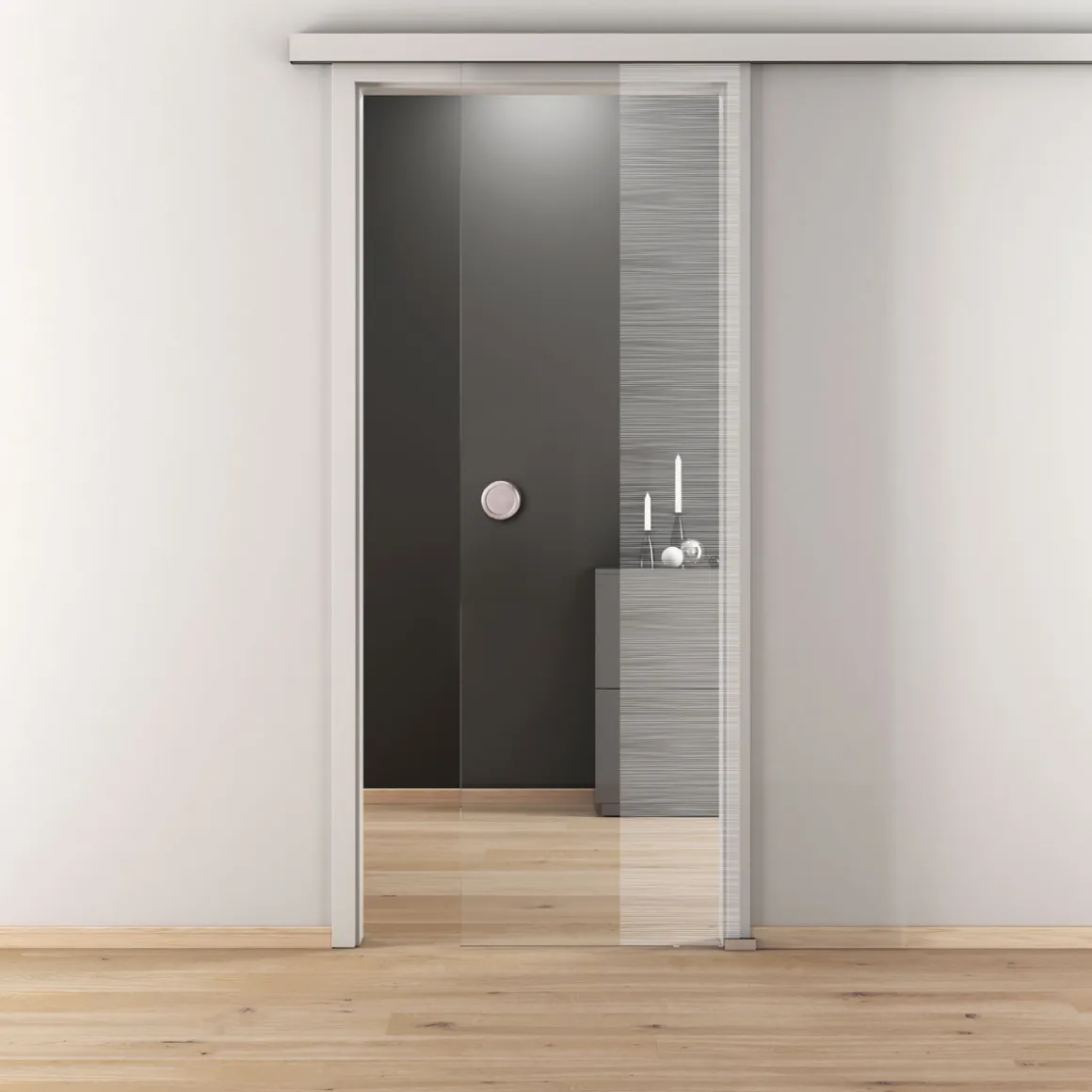 Die Glasschiebetür NOVA 557 eignet sich ideal für alle, die auf der Suche nach einer modernen und platzsparenden Lösung sind. Ob im Wohn- oder Arbeitsbereich – diese Tür verleiht jedem Raum eine elegante Note.