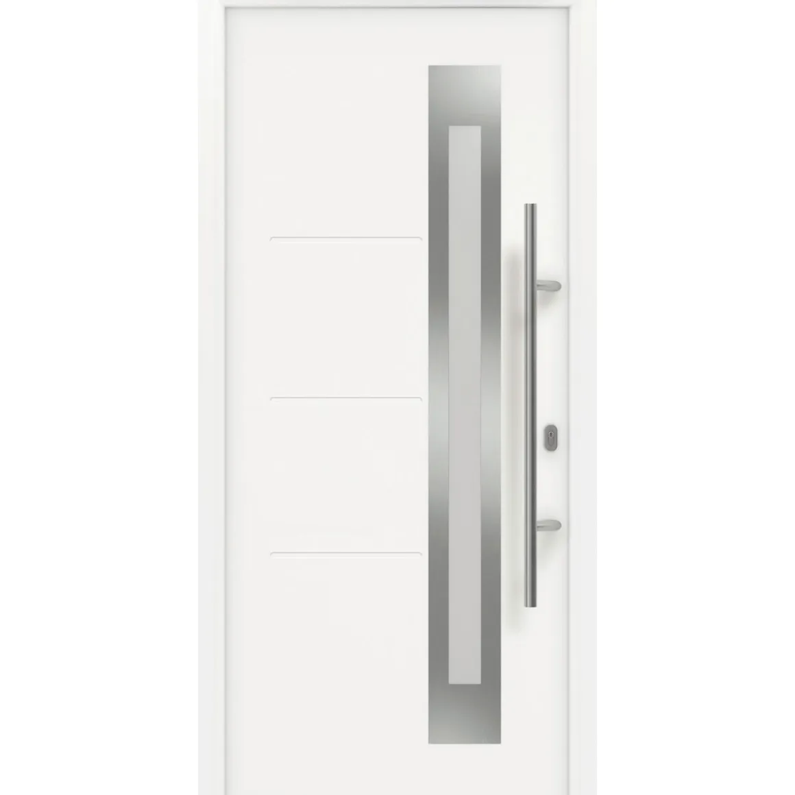 BxH ca. 110×210 cm, innen und außen flächenbündiges Stahl-Türblatt Stärke 65 mm, verkehrsweiß (RAL 9016) oder anthrazitgrau (RAL 7016), PU-Hartschaumfüllung, thermisch getrennter Aluminium-Rahmen, Stärke 60,5 mm, 3-fach-Isolierverglasung mit beidseitigem Sicherheitsglas, innen und außen satiniert, 3-fach-Verrieglung