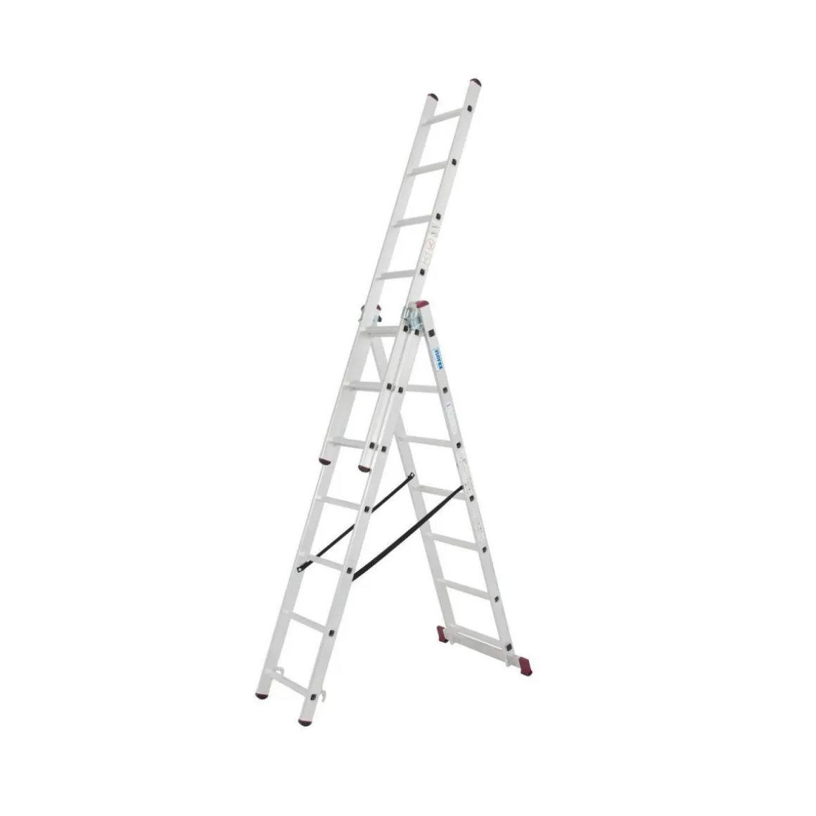 - Dreiteilige Konstruktion ermöglicht vielseitige Einsatzmöglichkeiten als Anlege-, Schiebe- oder Doppelstehleiter.
