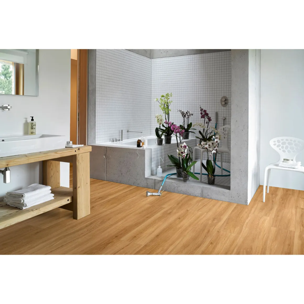 Der formstabile Bodenbelag ist sowohl für den privaten als auch gewerblichen Bereich geeignet und kann in Wohnräumen sowie Feuchträumen verlegt werden. Durch seine Beständigkeit gegenüber Stuhlrollen und Flecken eignet er sich besonders gut für stark frequentierte Bereiche.