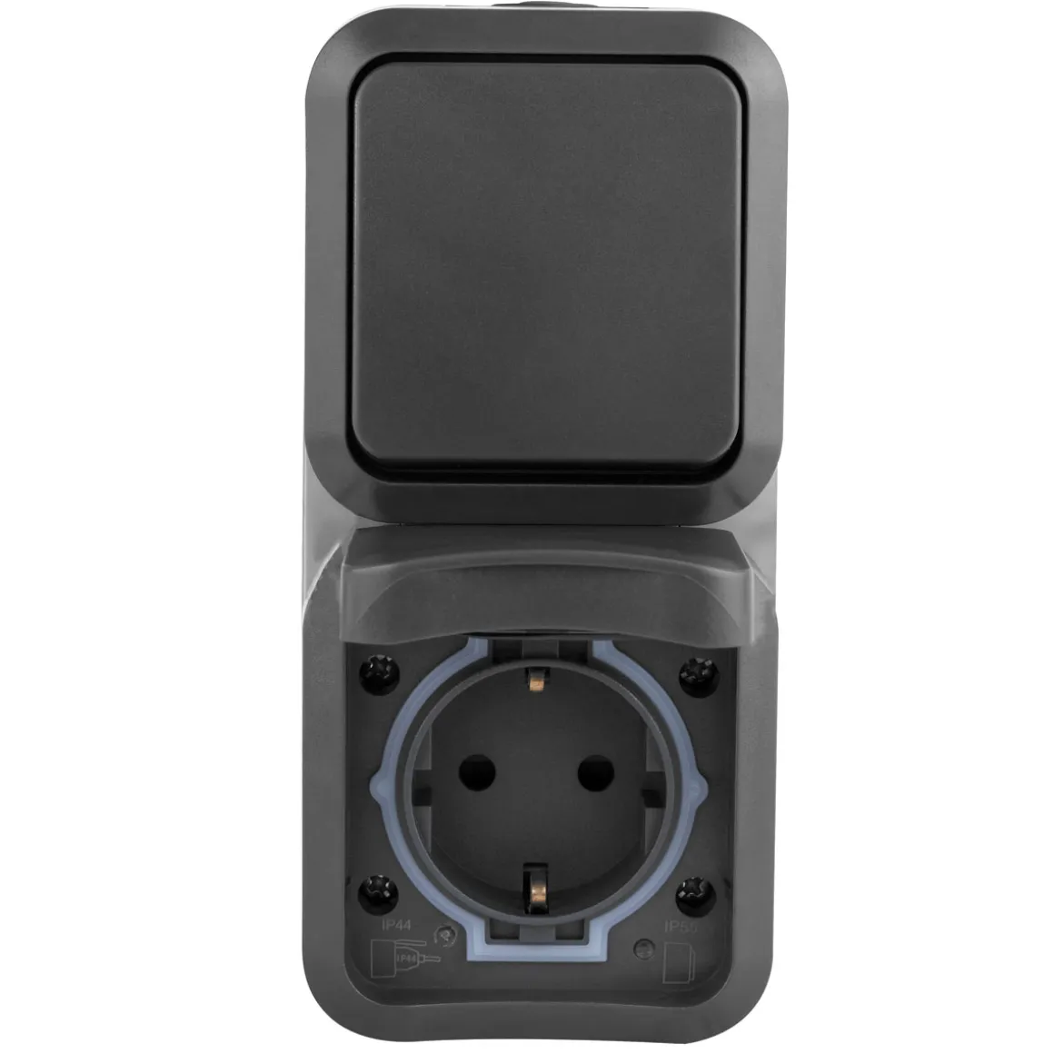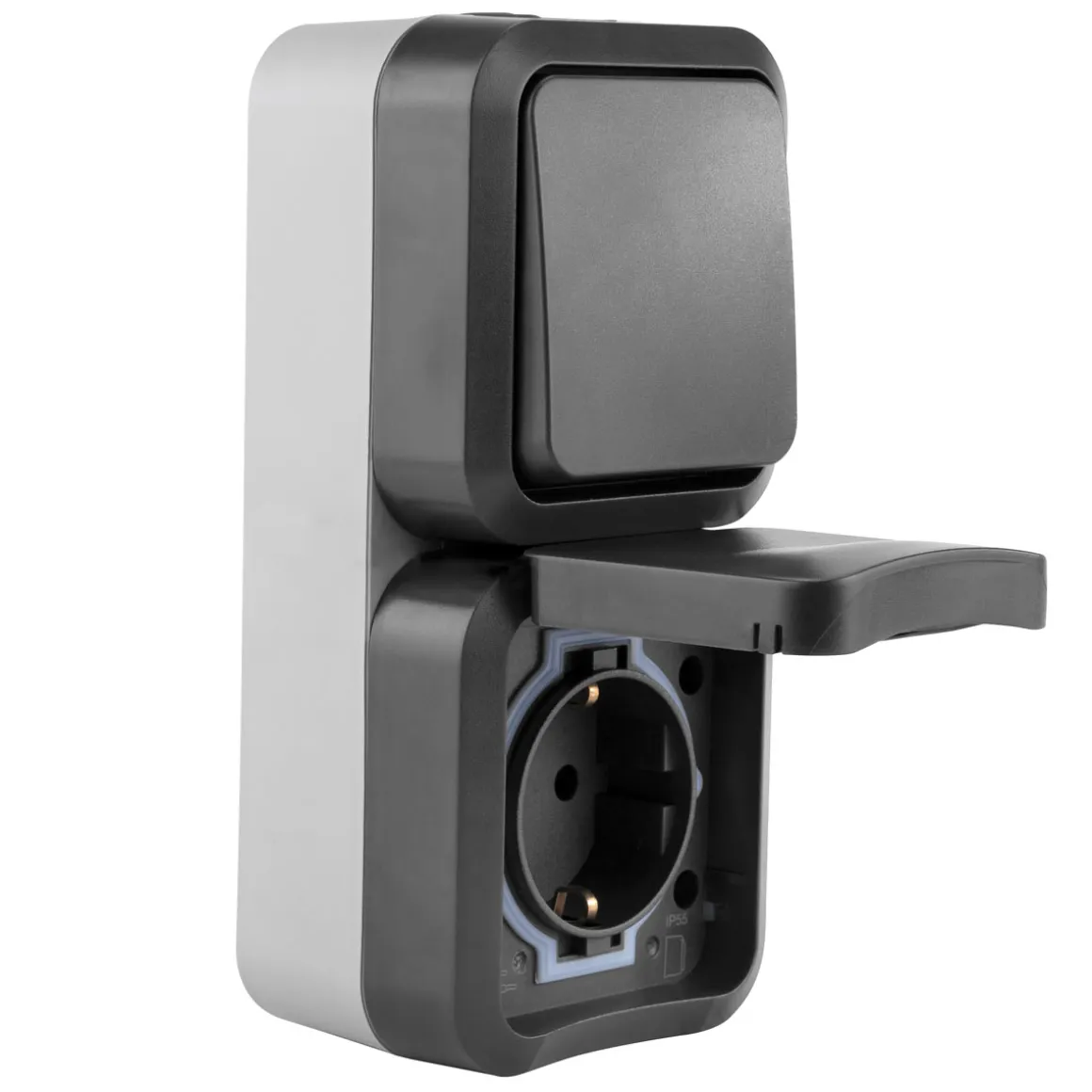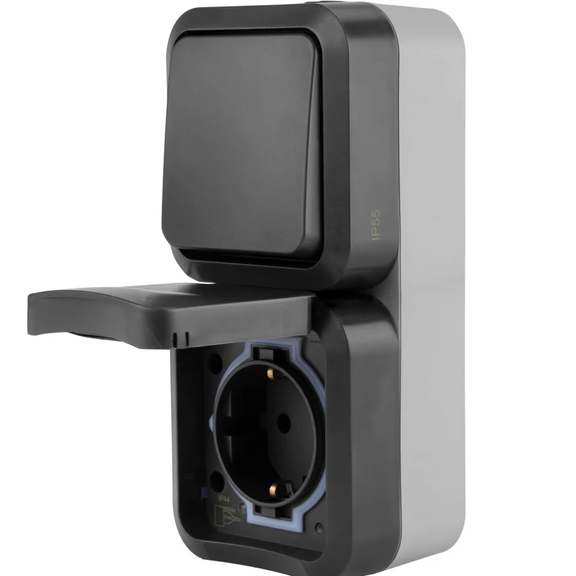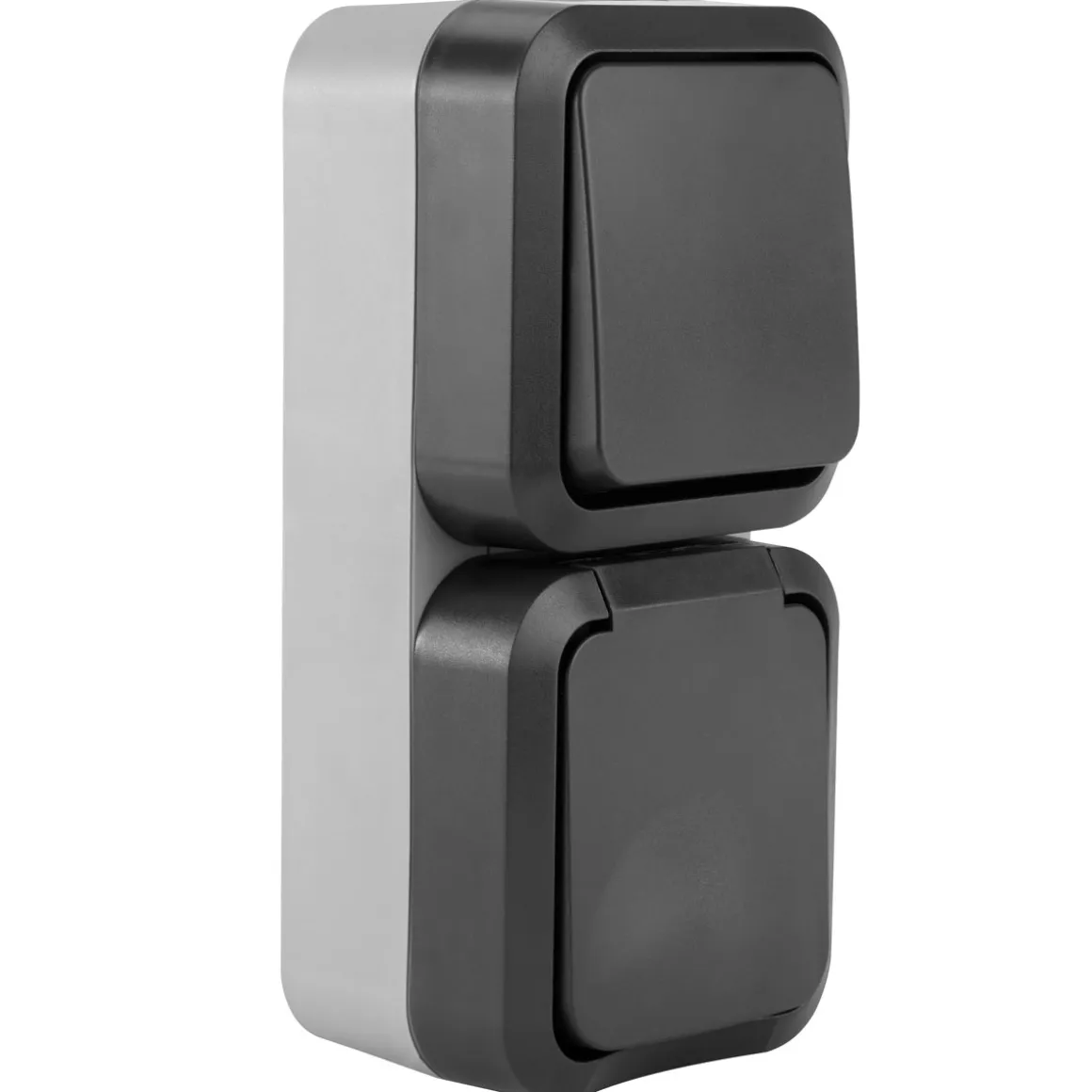 KOMPATIBEL – 2-fach Kombination Aus-/Wechselschalter und Steckdose senkrecht kombinierbar mit dem Aufputz-Feuchtraum-Schalterprogramm AquaStorm von REV Ritter für eine individuelle Raumgestaltung im und rund ums Haus
