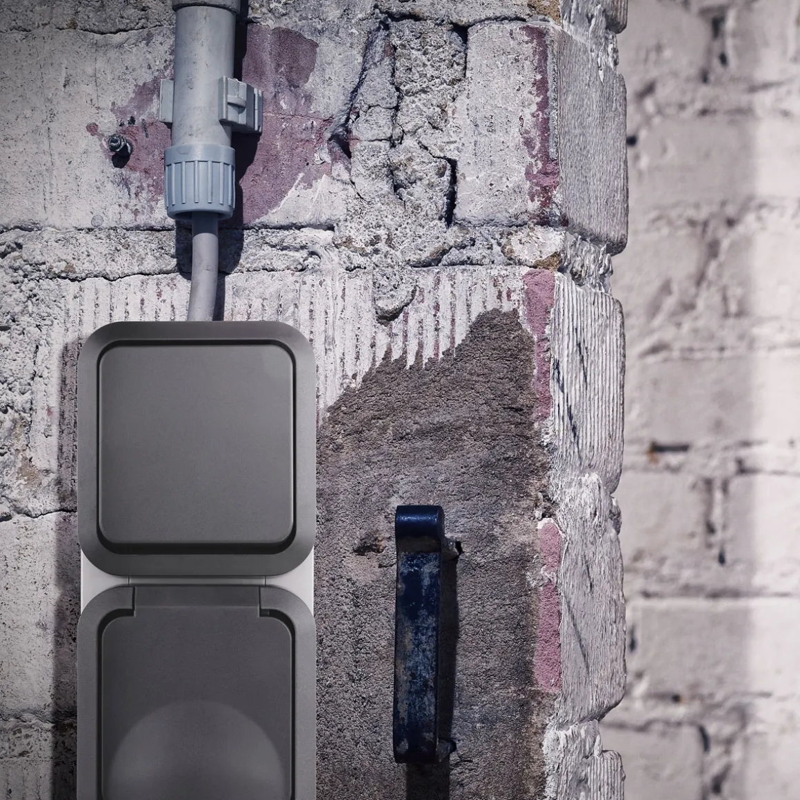 Strahlwassergeschützes Aufputz-Schalterprogramm Aquastorm für eine sichere und zuverlässige Elektroinstallation im und rund ums Haus. Die ansprechende Bauform in modernem BI-Color-Design eignet sich für die Anwendung in Feuchträumen wie Waschküche oder Kellerraum und im Freien wie Terrasse und Balkon. Durch den Einsatz hochwertiger Materialen und einer sorgfältigen Verarbeitung, ermöglicht das bewährte Programm einen hohen Qualitätsanspruch und eine langlebige Nutzung. Selbstverständlich entsprechen die Gerätesockel den gültigen Normen und sind alle VDE-geprüft. Die Steckdosen sind zur Sicherheit mit einem erhöhten Berührungsschutz ausgestattet. Die montage- und installationsfreundlichen Aufputzgeräte eignen sich ideal für die Basisinstallation und die einfache Nachrüstung Ihrer Hauselektrik.