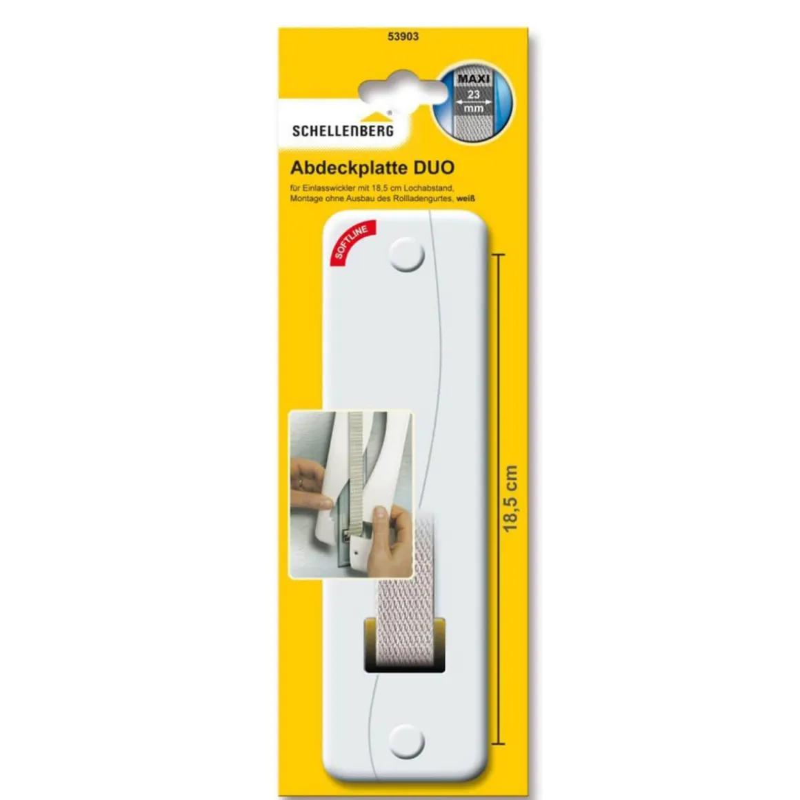 Die Schellenberg Abdeckplatte DUO ist für Rollladengurte mit einer Breite von 23 mm geeignet und lässt sich damit problemlos in das Schellenberg Rollladen-System „Maxi“ integrieren. Sie ist in verschiedenen Maßen und mit verschiedenen Lochabständen erhältlich. Dadurch können Sie immer die perfekt passende Abdeckung für Ihre individuelle Einbausituation und Ihren Einlasswickler auswählen.