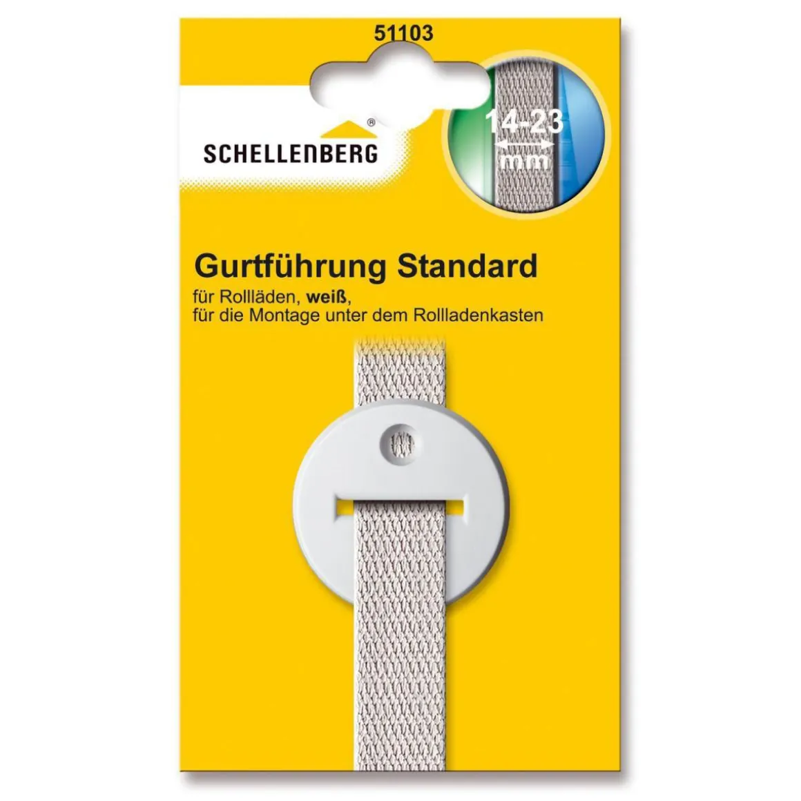 Die Schellenberg Gurtführung STANDARD rund ist für Rollladengurte mit einer Breite von 14 mm bis 23 mm geeignet. Mit der passenden Gurtführung verschleißen Gurtbänder weniger und sehen dadurch länger neuwertig aus.