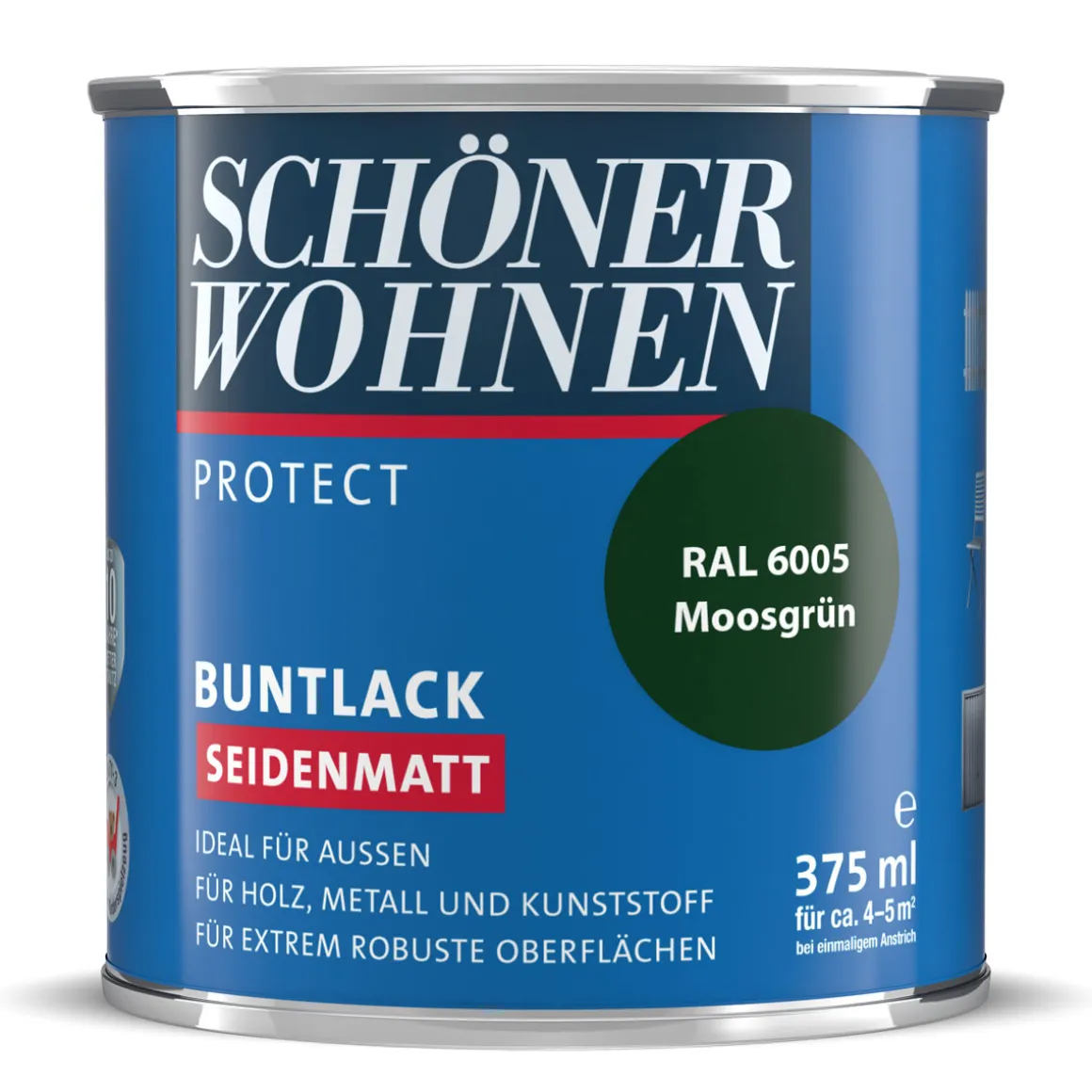Mit dem Schöner Wohnen Farbe Buntlack Protect in moosgrün seidenmatt verleihen Sie Ihren Holz-, Metall- und Kunststoffoberflächen im Innen- und Außenbereich einen besonders strapazierfähigen Anstrich. Der Lack ist leicht aufzutragen, hat eine hohe Deckkraft und ist wetterbeständig.