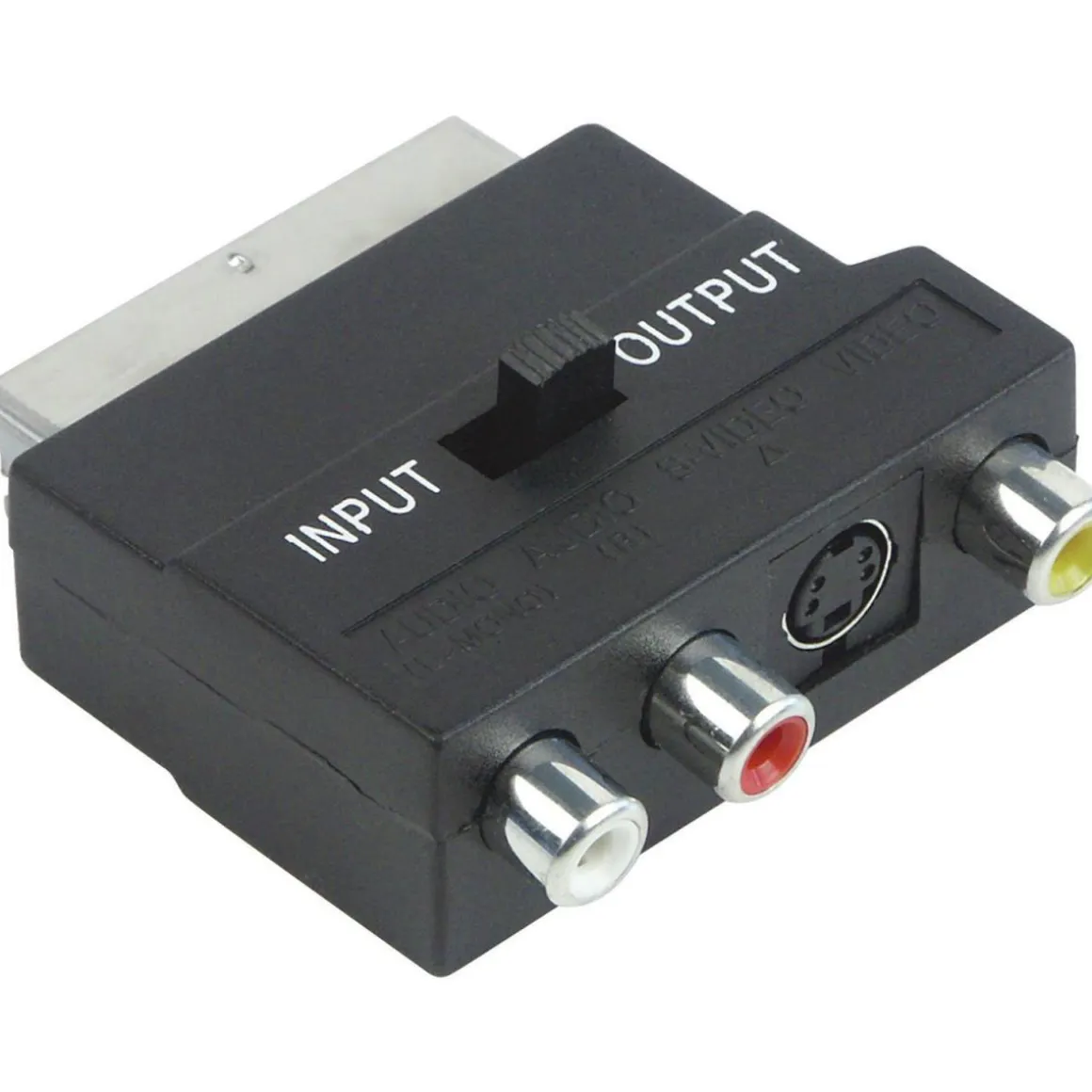 - Fünf Anschlüsse: 3 x Cinch-Buchse, 1 x S-VHS-Buchse, 1 x SCART Stecker