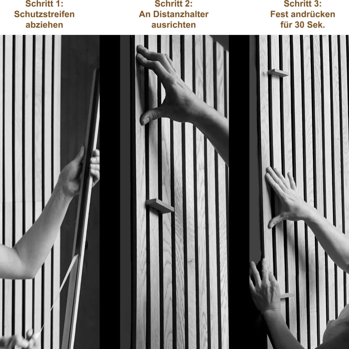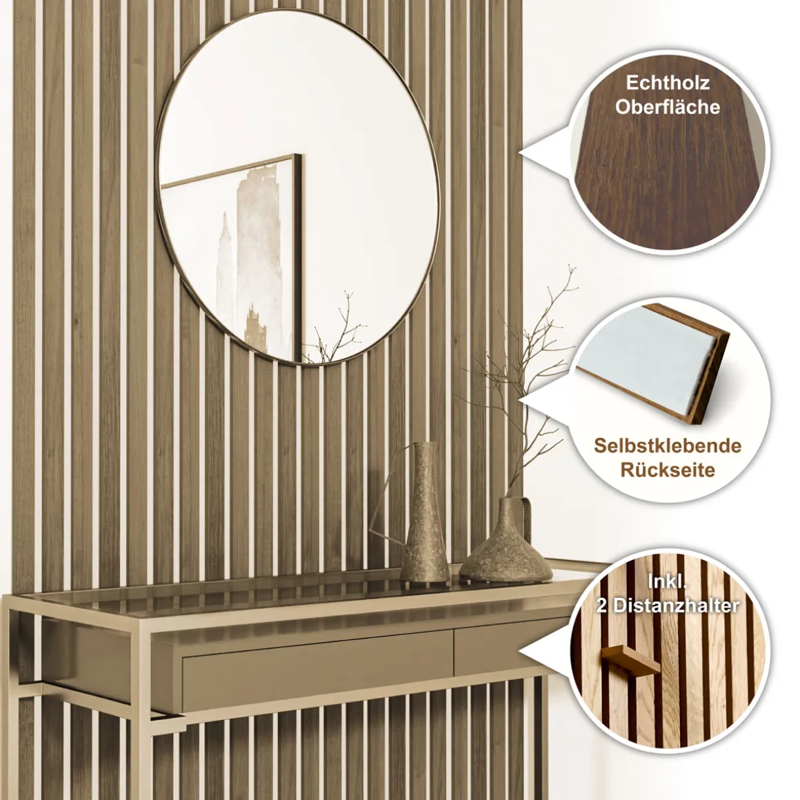 Dieses Wandpaneel aus Premium Eichenfurnier (Aufbauhöhe: ca. 9 mm) trägt durch seine attraktive Optik zu einem wohnlichen Gesamtbild bei. Es besteht aus 4 einzelnen Lamellen (L x B: ca. 250 x 3,5 cm), die sich sowohl zur Wand- als auch zur Deckenmontage eignen. Dabei müssen Sie nicht einmal bohren, da die Leisten selbstklebend sind. Dank der beiliegenden Abstandslehre ist sichergestellt, dass die Distanz zwischen den Elementen jeweils exakt 16,5 mm beträgt. So bleibt der Hintergrund sichtbar und die Kombination mit LEDs möglich. Gleichzeitig veredelt die gebürstete Oberfläche, zu 100 % recyclebaren Echtholzes das Interieur durch rustikalen Chic. Wer auf sehenswerte Weise eine behagliche Kulisse schaffen will, ist mit diesem Wandpaneel aus Eiche beraten. Entscheiden Sie sich für zeitlos-schlichte Ästhetik und beeindruckende Funktionalität! Bitte beachten Sie, dass aufgrund der hochwertigen Echtholzoberfläche der Wandpaneele unterschiedliche Maserungen auftreten können. Diese natürlichen Variationen sind kein Grund zur Beanstandung, sondern vielmehr ein Qualitätsmerkmal, das die Einzigartigkeit jedes einzelnen Paneels unterstreicht.