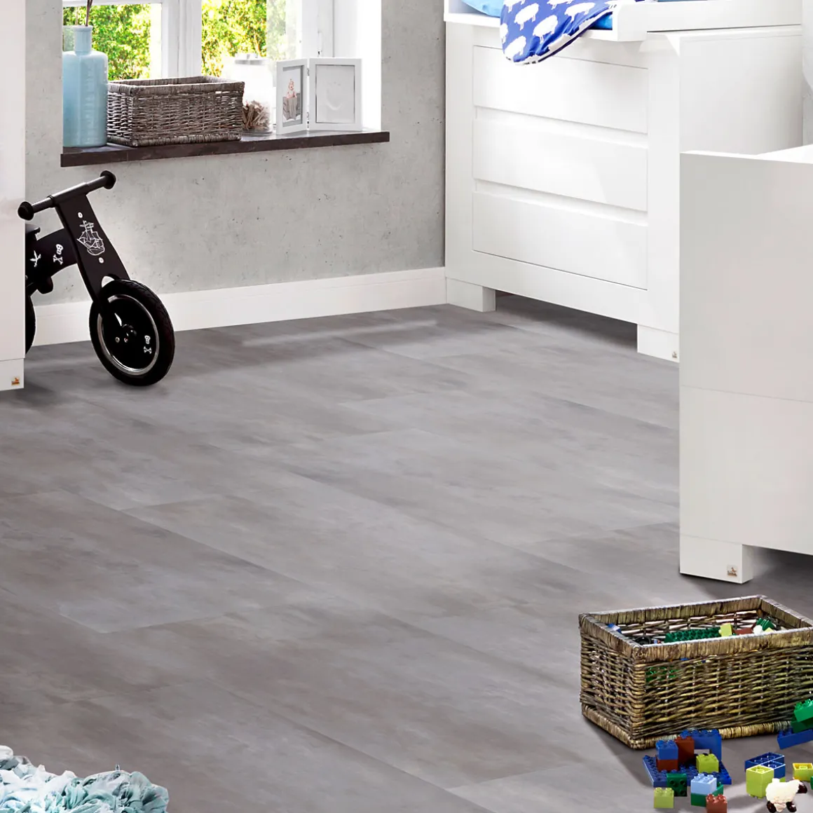 Dieser Vinylboden im XL Fliesenformat überzeugt durch seine wasserabweisende Oberfläche und seine besonders hohe Ausdehnungsstabilität.