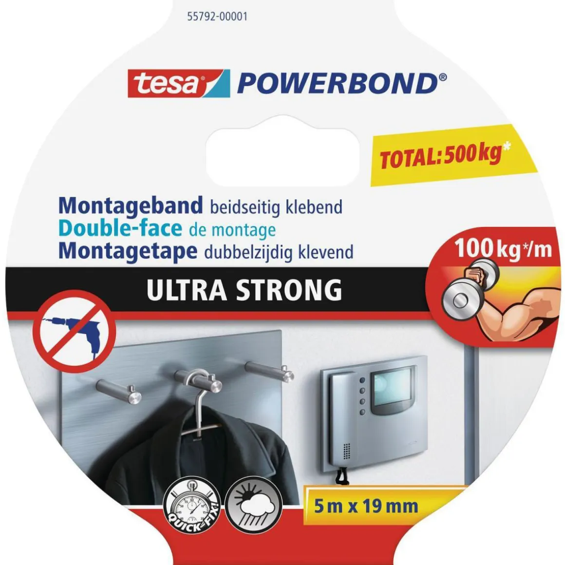 Das Tesa Powerbond Ultra Strong Montageband bietet eine extrem hohe Belastbarkeit von bis zu 10 kg pro Anwendung. Es hält auf fast allen Untergründen und ist individuell zuschneidbar. Ob schwere Bilder oder Regale – mit dem Tesa Powerbond Ultra Strong können Sie alles sicher befestigen.