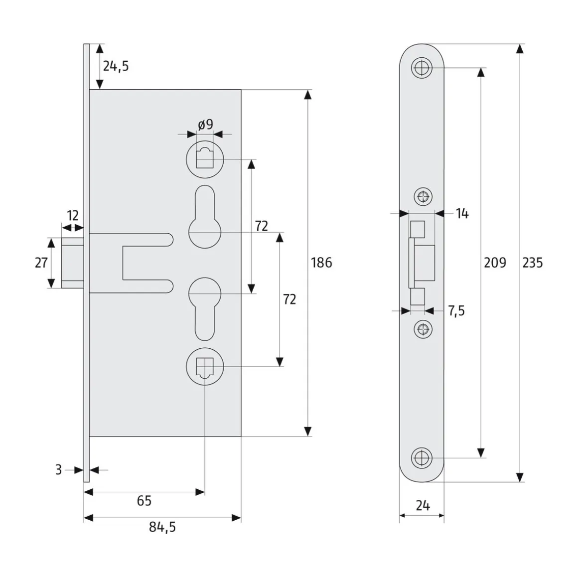 - Kompakte Maße: Kastenhöhe 186 mm, Stulpenlänge 235 mm, Stulpenbreite 24 mm – ideal für Standardtüren