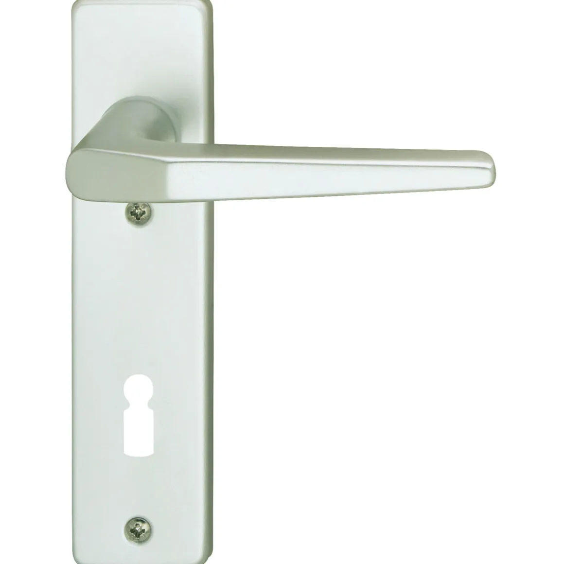 Mit der Alpertec Kurzschildgarnitur Florida verleihen Sie Ihrer Zimmertür eine moderne Eleganz. Die silberne Grundfarbe und die satinierte Oberfläche sorgen für einen edlen Look, der zu jedem Einrichtungsstil passt.