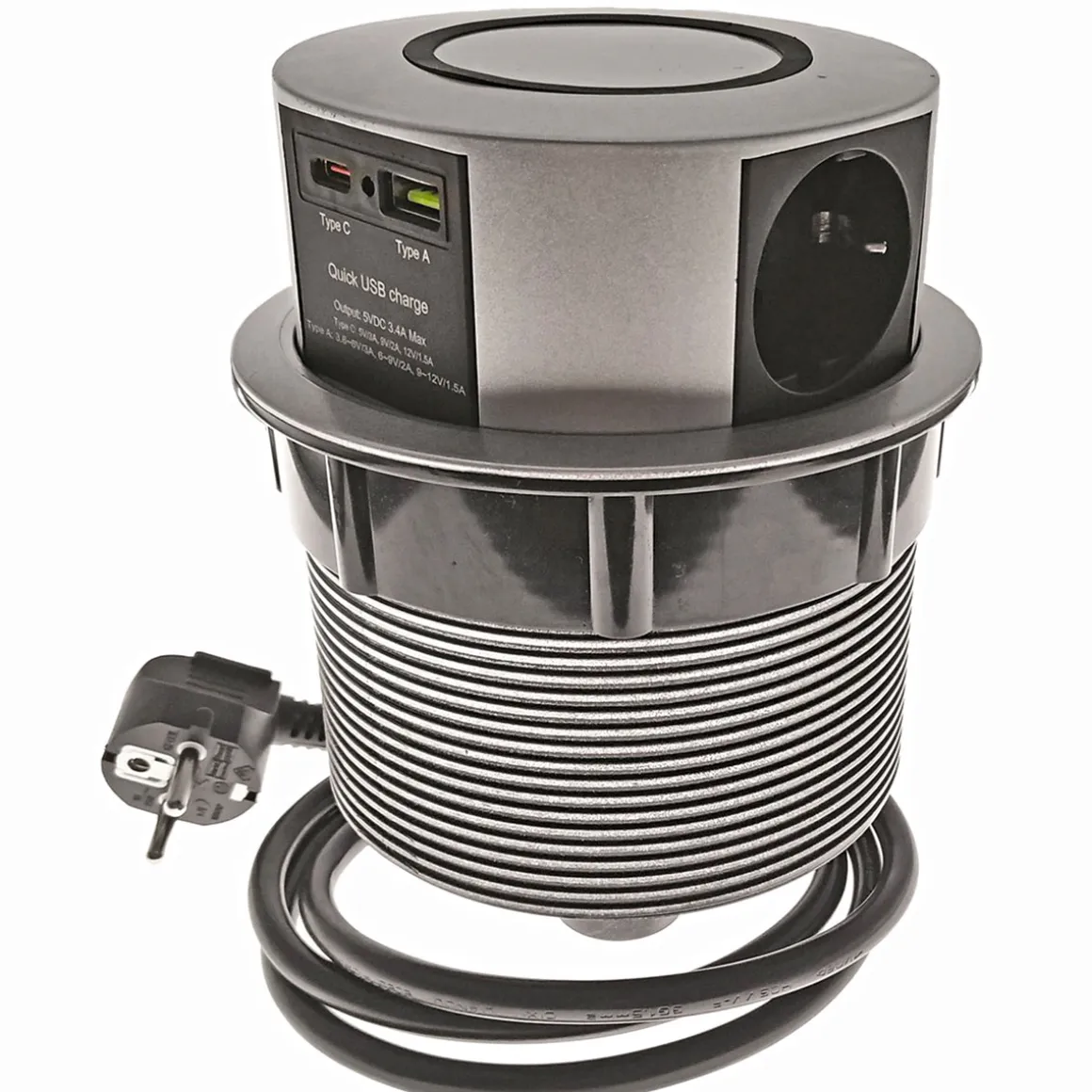 - Funktionsweise: Versenkbare Steckdosenleiste mit 3 Schuko-Steckdosen und 2 USB-Anschlüssen (1x USB-A, 1x USB-C)