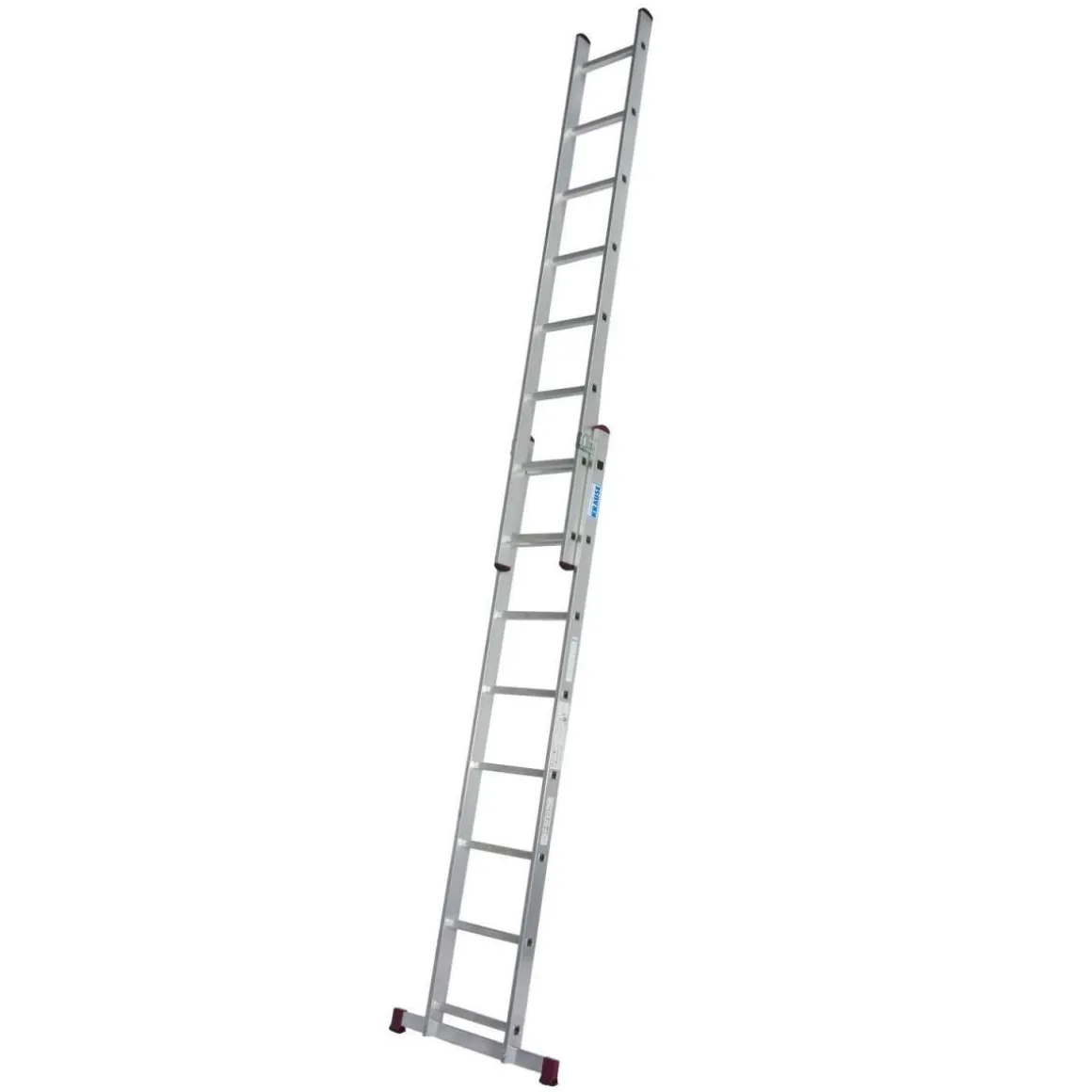 Die Krause CORDA Schiebeleiter ist eine zweiteilige Anlegeleiter mit geriffelten Stufen und einer breiten Quertraverse. Sie ist aus Aluminium gefertigt und hat eine Belastbarkeit von bis zu 150 kg. Mit einer Arbeitshöhe von bis zu 4,95 m eignet sie sich perfekt für den Einsatz im Innen- und Außenbereich.