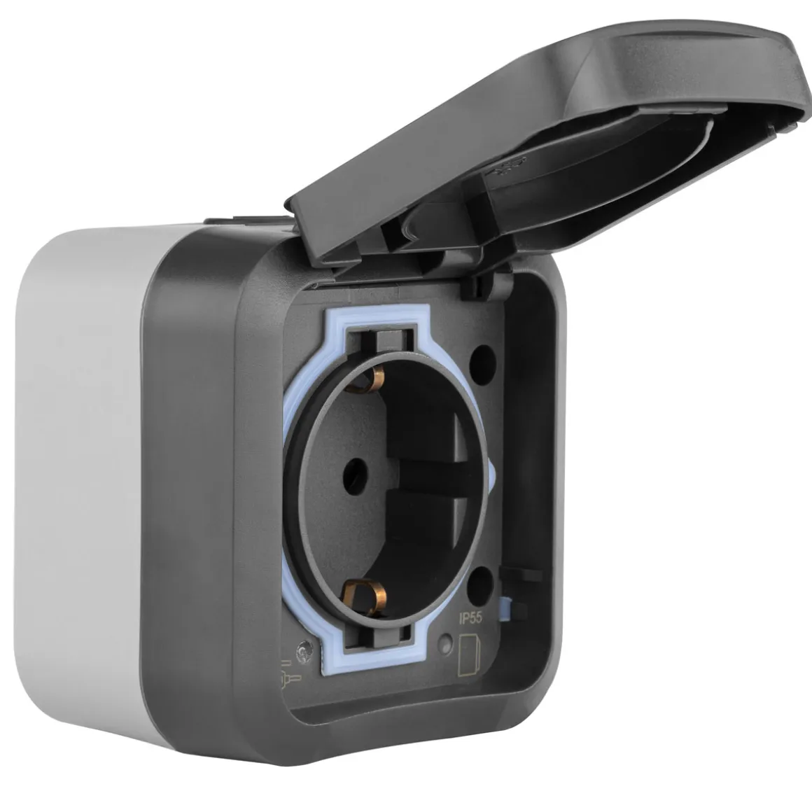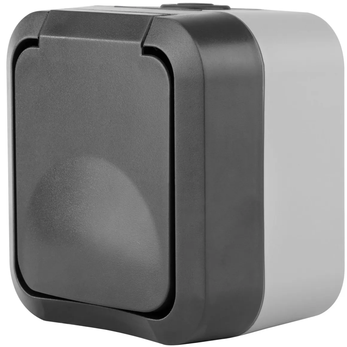 SOLIDE – robustes und bruchfestes Gehäuse in ansprechendem BI-Color-Design aus hochwertigem Spezialkunststoff mit erhöhtem Berührungsschutz, Klappdeckel und biegsamer Tülle für eine einfache Leitungseinführung