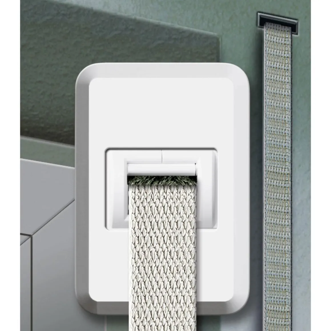 Für ein optisch perfektes Montage-Ergebnis sorgt die im Lieferumfang enthaltene formschöne Abdeckhaube, die zum Abschluss auf die Gurtführung aufgesteckt wird. Sie verdeckt zum Beispiel die Befestigungsschrauben, die für einen sicheren Halt an der Wand sorgen.