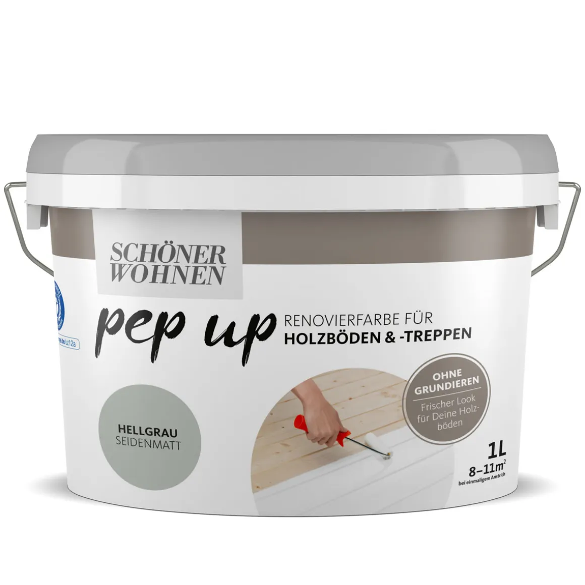 Die Renovierfarbe von Schöner Wohnen Farbe bietet Ihnen eine einfache Möglichkeit, Ihre alten Holzboden oder Treppenelemente aufzufrischen. Mit nur einem Anstrich erhalten Sie eine seidenmatte Oberfläche in trendigem Hellgrau. Dabei überzeugt das Produkt nicht nur optisch sondern auch durch seine schnelle Trocknungszeit sowie seine hohe Belastbarkeit nach nur acht Tagen. Bestellen Sie jetzt die Schöner Wohnen Farbe pep up Holzböden und -treppenhellgrau online bei !