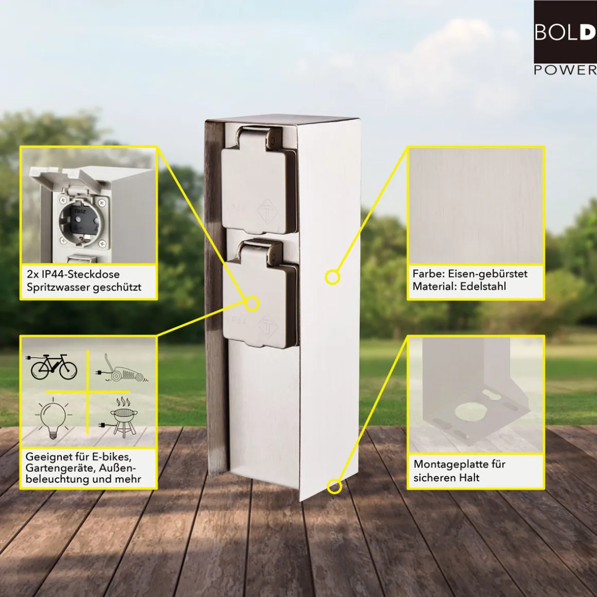 Produktdetails zur Bold Steckdosensäule ORIO 2fach IP44 Eisen-gebürstet