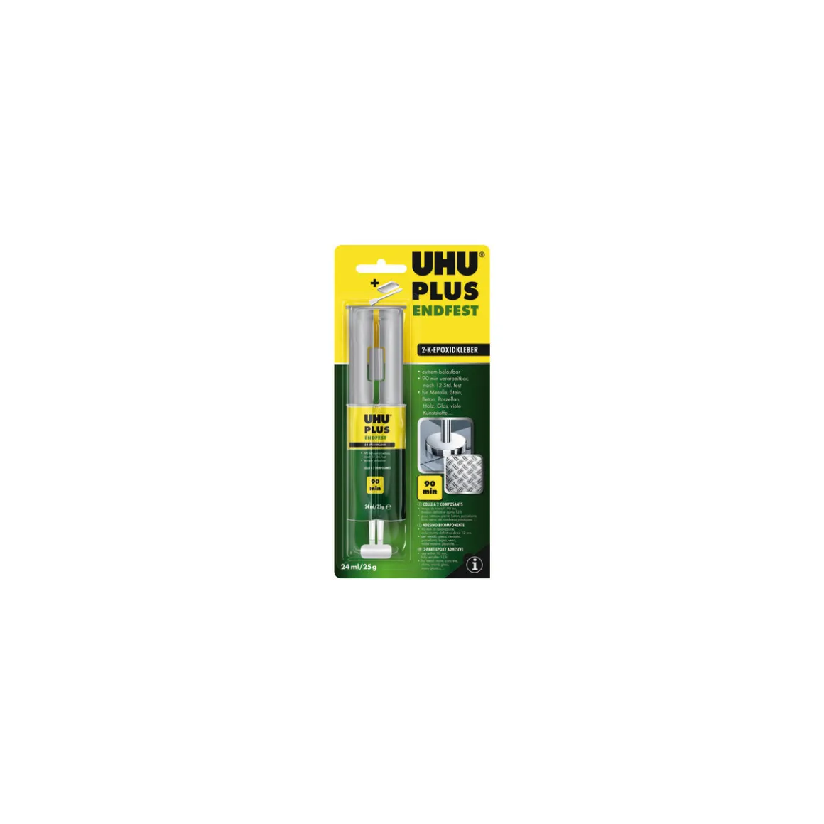Mit dem UHU Zwei-Komponenten-Klebstoff plus endfest Doppelkammerspritze können Sie höchste Anforderungen und Belastungen meistern. Die praktische Doppelkammerspritze ermöglicht ein einfaches Ausdrücken der beiden Klebstoffkomponenten im korrekten Mischverhältnis.