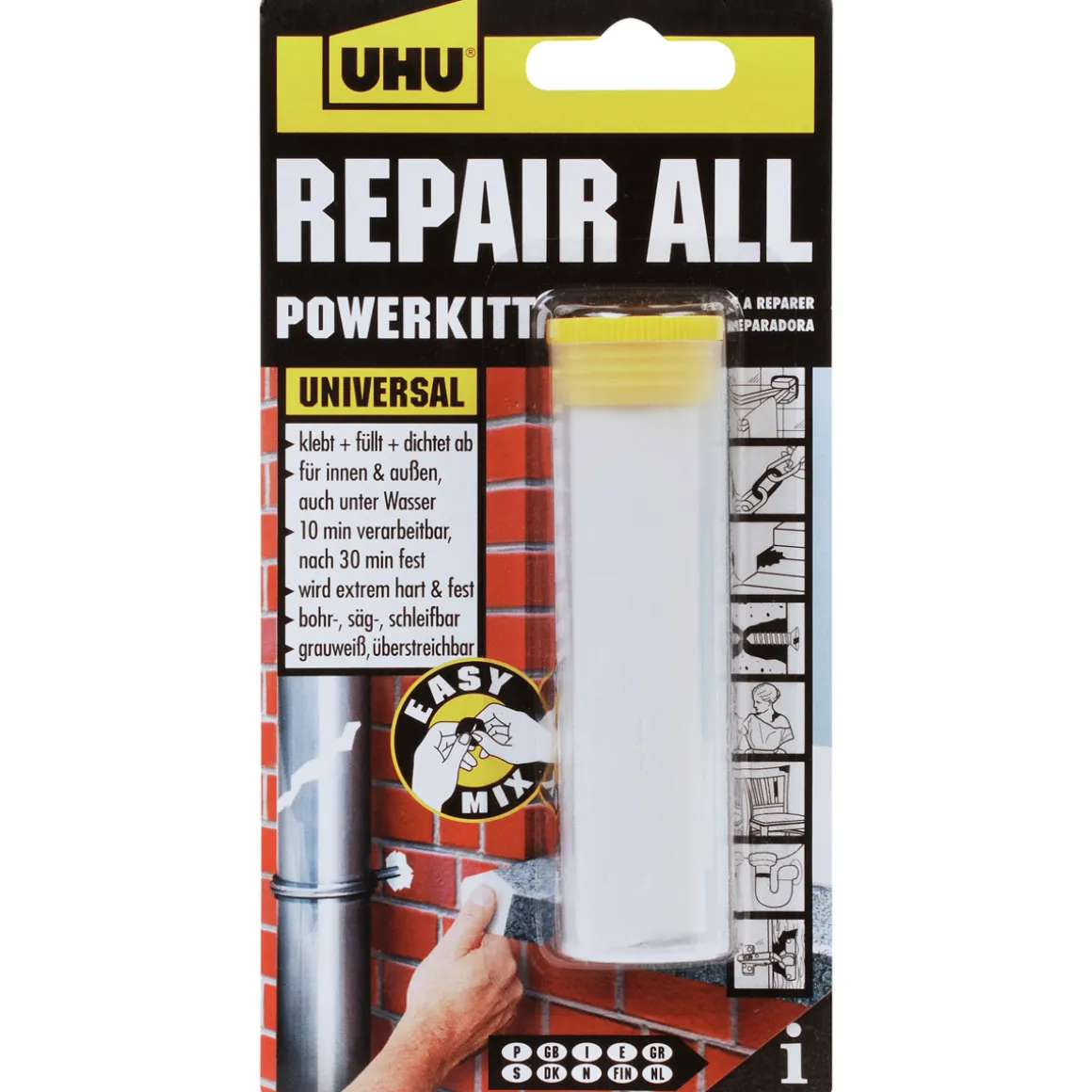 Produktdetails des UHU Zwei-Komponenten-Klebstoffs repair all powerkitt